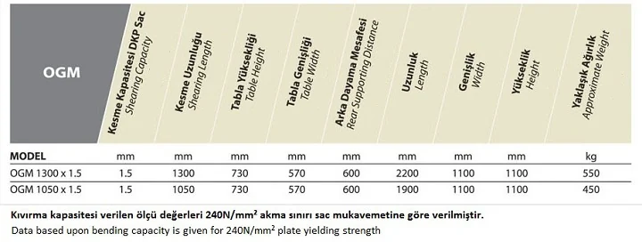 Döküm ve Çelik Konstrüksiyon Tabla Kullanıcının Saca Hakimiyetini Kolaylaştıran Geniş Tabla Kesme Anında Sacın Kaymasını Önleyen Mekanik Baskı Sistemi Dayanıklı Düşük Karbonlu Çelikten İmal Edilmiş Kesme Kolu Dar ve İnce Sacların Kesimine Uygun Arka Dayama Sistemi Hassas ve Düzgün Kesim Sağlayan Açılı Çelik ve Üst Bıçak Açılı Sac Kesimine Uygun Ön Gönye ve Dik Kesim Sağlayan Milimetrik Cetvel
